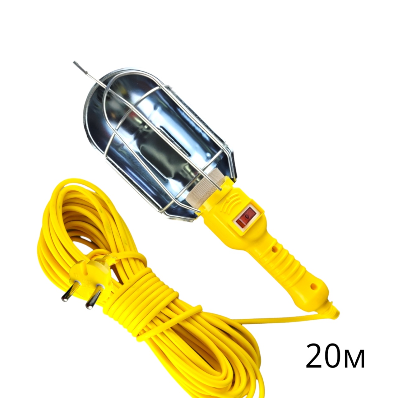 Подвесной светильник для гаража 20 метров оборудован керамическим цоколем Е 27 для ламп накаливания. Работает от сети переменного тока с напряжением до 220 В. Переносная лампа для гаража выполнена из жаропрочного и антикоррозийного купола и удобной ручки из ABS-пластика, на которой расположен клавишный выключатель. Защитная стальная решетка предохраняет лампу от ударов.