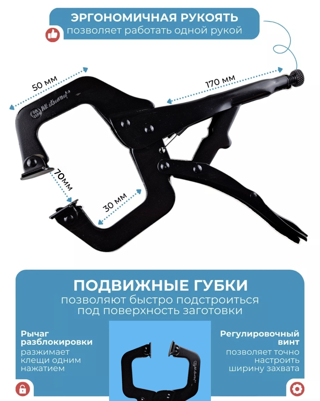 · Регулировочный винт: Позволяет точно настроить величину раствора губок под конкретную задачу.