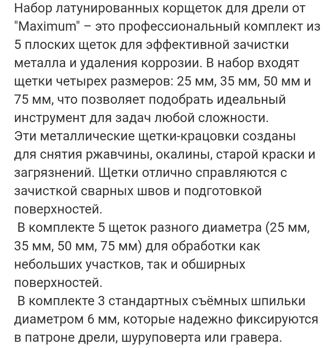 Набор латунированных корщеток для дрели от "Maximum" – это профессиональный комплект из 5 плоских щеток для эффективной зачистки металла и удаления коррозии. В набор входят щетки четырех размеров: 25 мм, 35 мм, 50 мм и 75 мм, что позволяет подобрать идеальный инструмент для задач любой сложности.